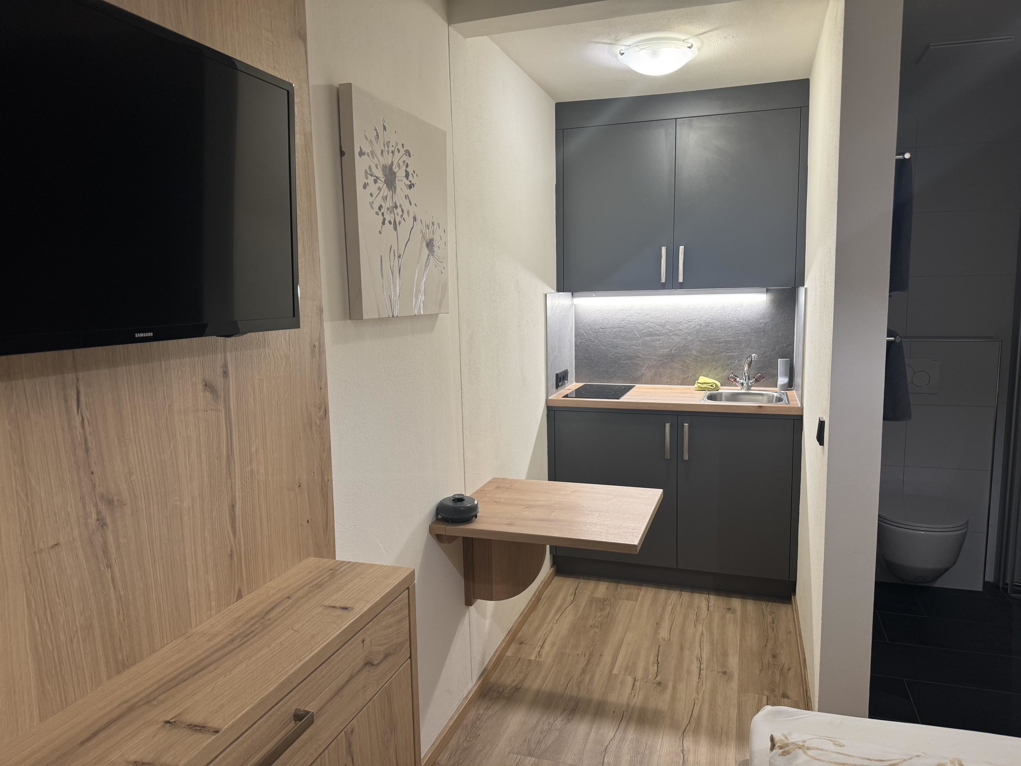 Kleine 1-Zimmer Wohnung mit Dusche/WC mit Kochnische, Kühlschrank und 2 Herdplatten.
