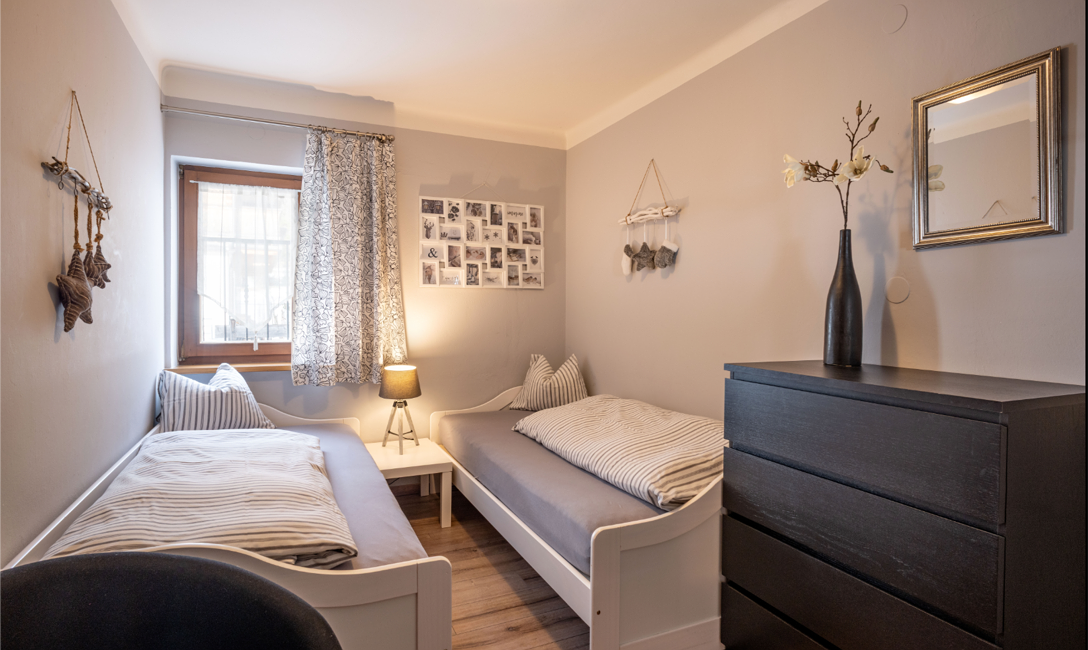 Unsere voll ausgestattete Küche mit Geschirrspüler verspricht entspanntes Kochen nach einem erlebnisreichen Tag in den Bergen. In den zwei Schlafzimmern, einem mit einem Doppelbett und dem anderen mit zwei Einzelbetten, finden Sie Rückzug und Komfort für erholsame Nächte.