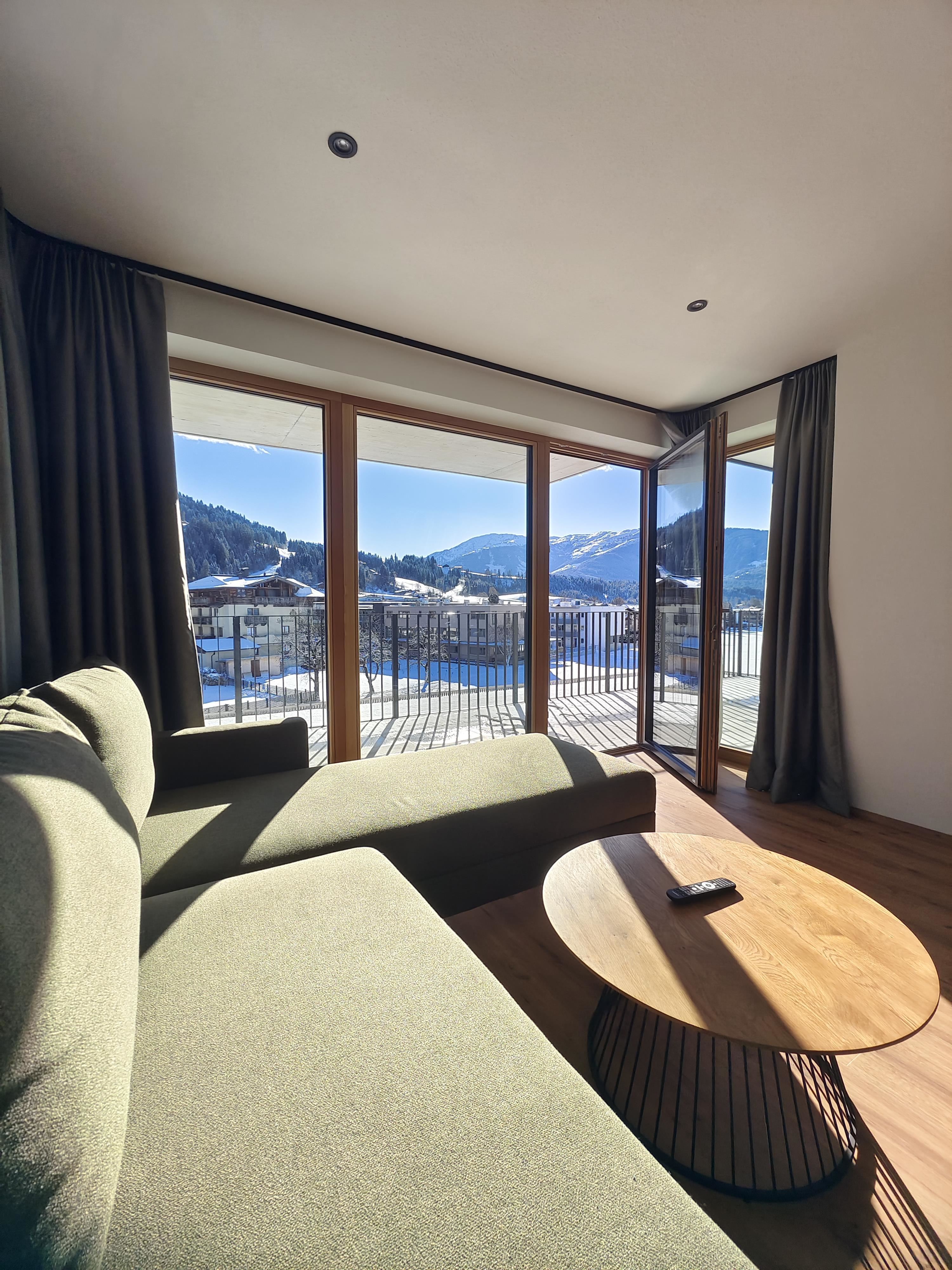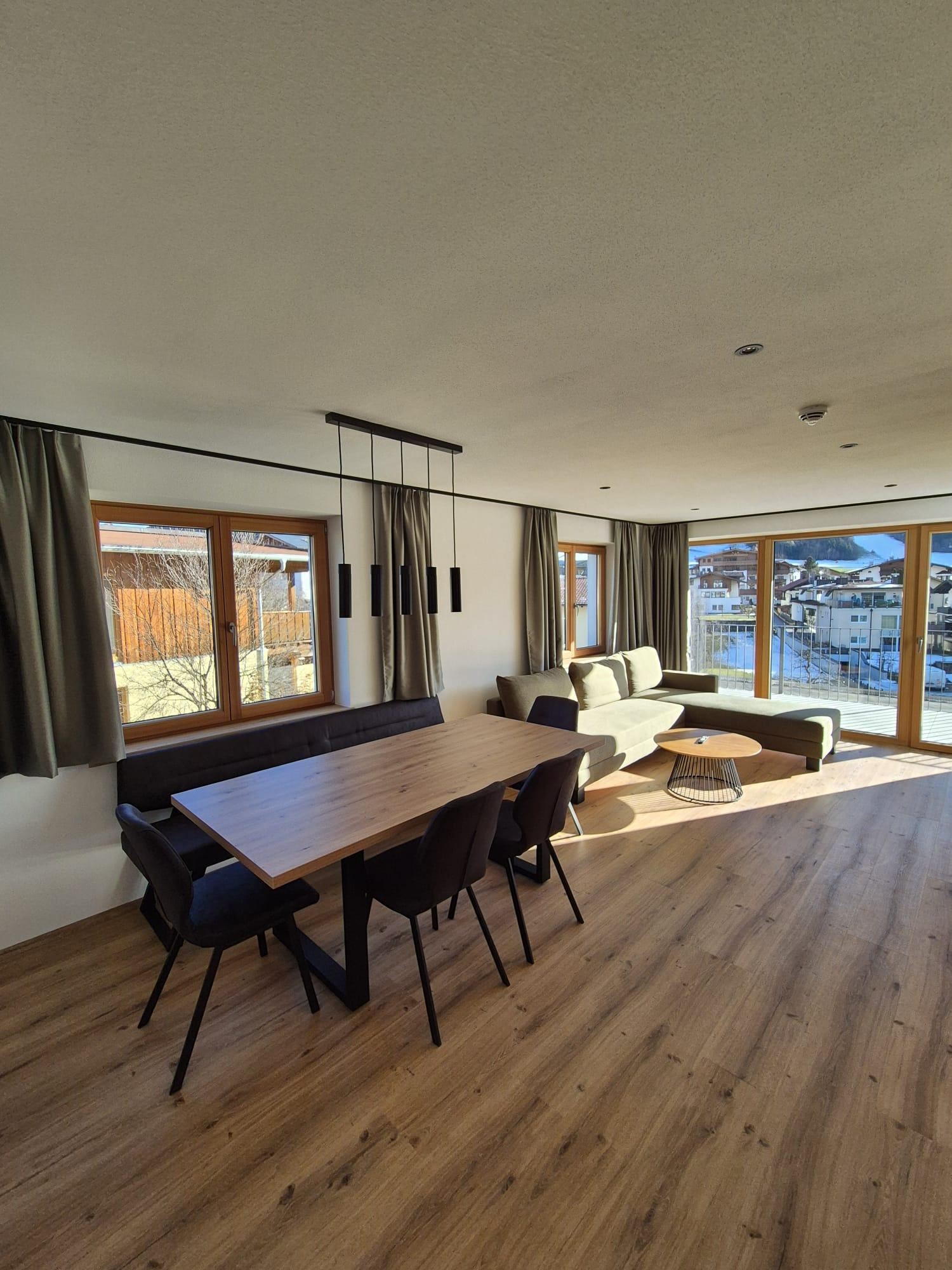 Wohnzimmer mit Panorama Fronten, Esszimmer mit Küche, 3 Schlafzimmer, 1x Bad/WC, 1x Dusche, 1x WC.