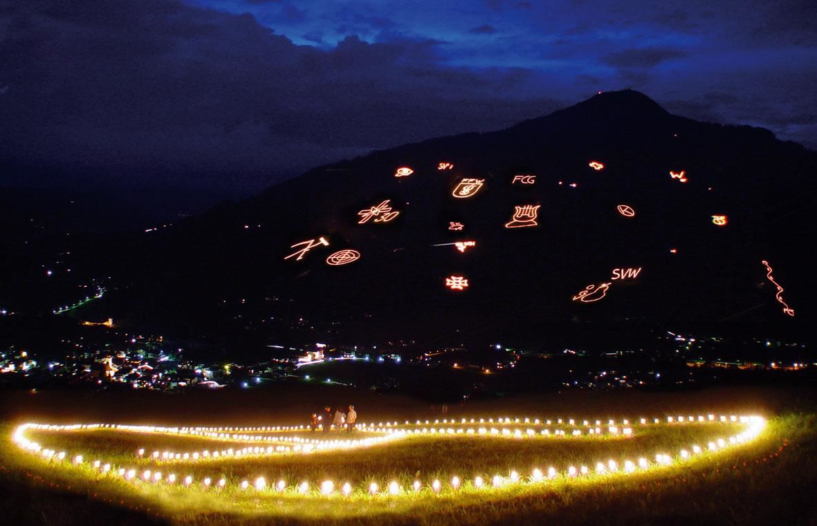 Wenn die Dämmerung hereinbricht, bietet sich den Zuschauern ein faszinierendes Schauspiel: Auf den Berghängen des Brixentals formen mittlerweile über 50.000 Fackeln eindrucksvolle Feuerbilder. Am Abend werden diese Kunstwerke von örtlichen Vereinen entzündet und verwandeln das Tal und die Berge in einen funkelnden Sternenhimmel.