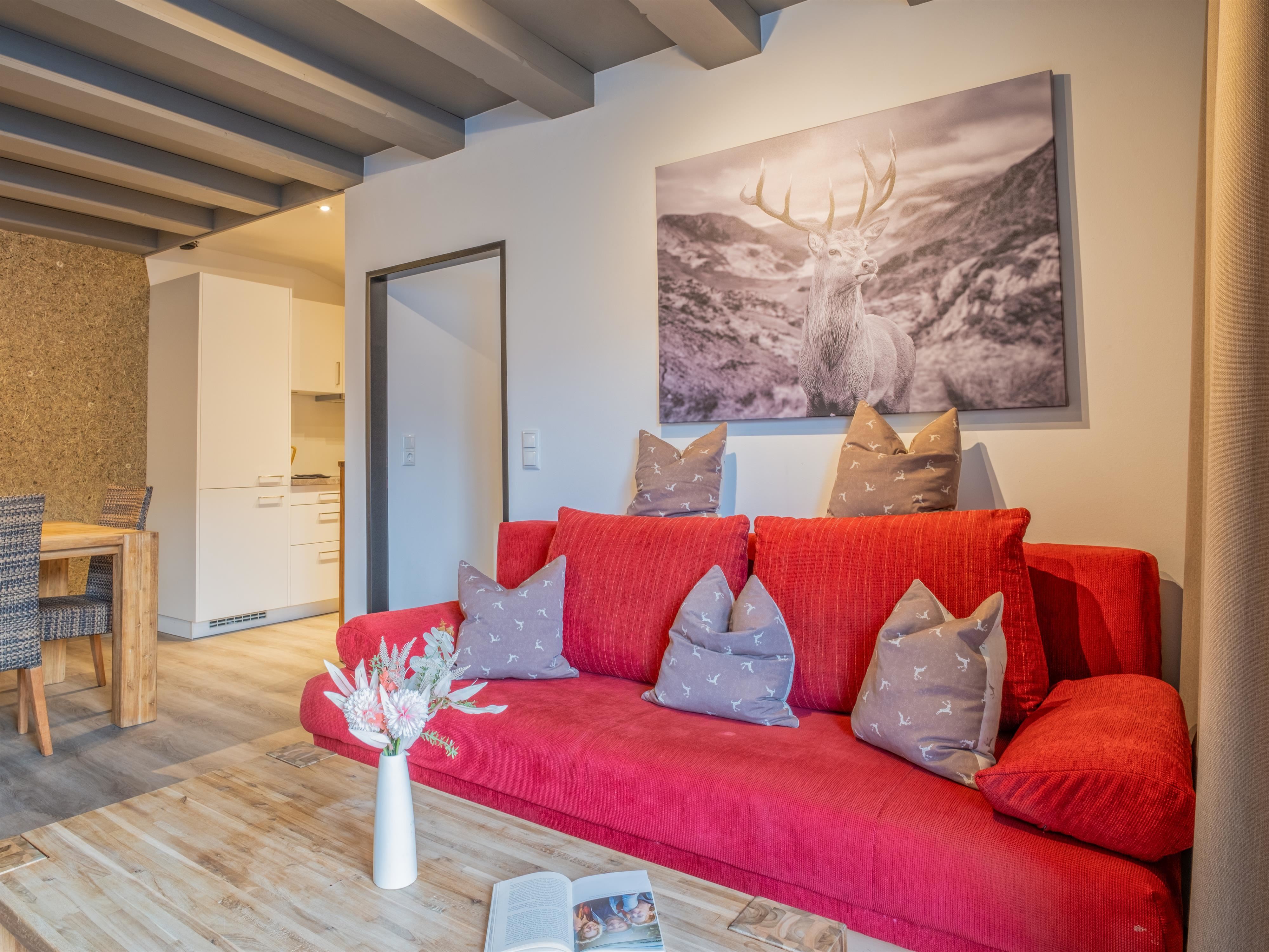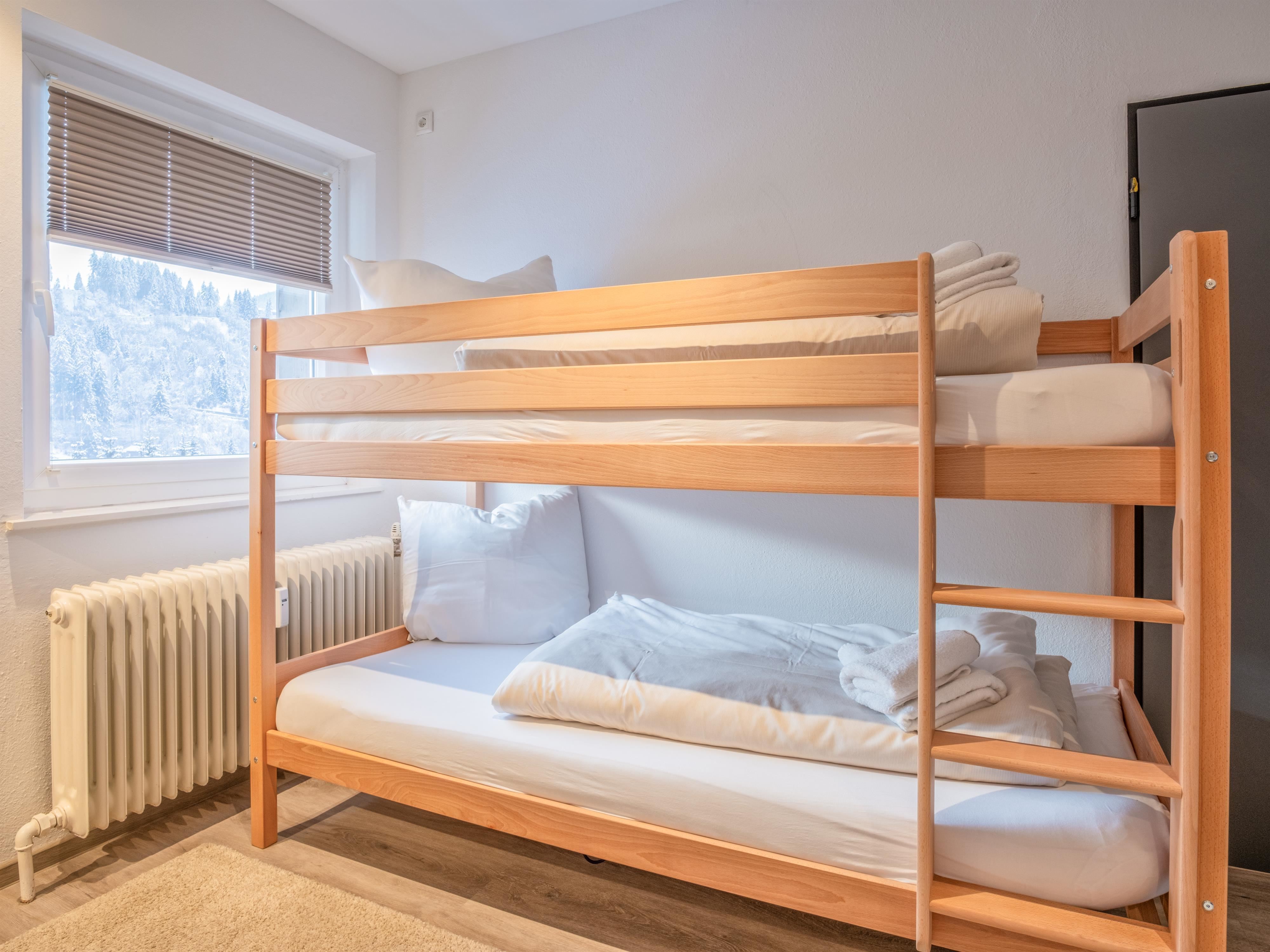 Unsere Ferienwohnung befindet sich im 3. Obergeschoss und verfügt über ein Schlafzimmer mit Doppel- und Etagenbett, einem Wohn-/Esszimmer mit einer ausziehbaren Schlafcouch für bis zu 2 Personen, einem Badezimmer mit Dusche und WC und einem Balkon.