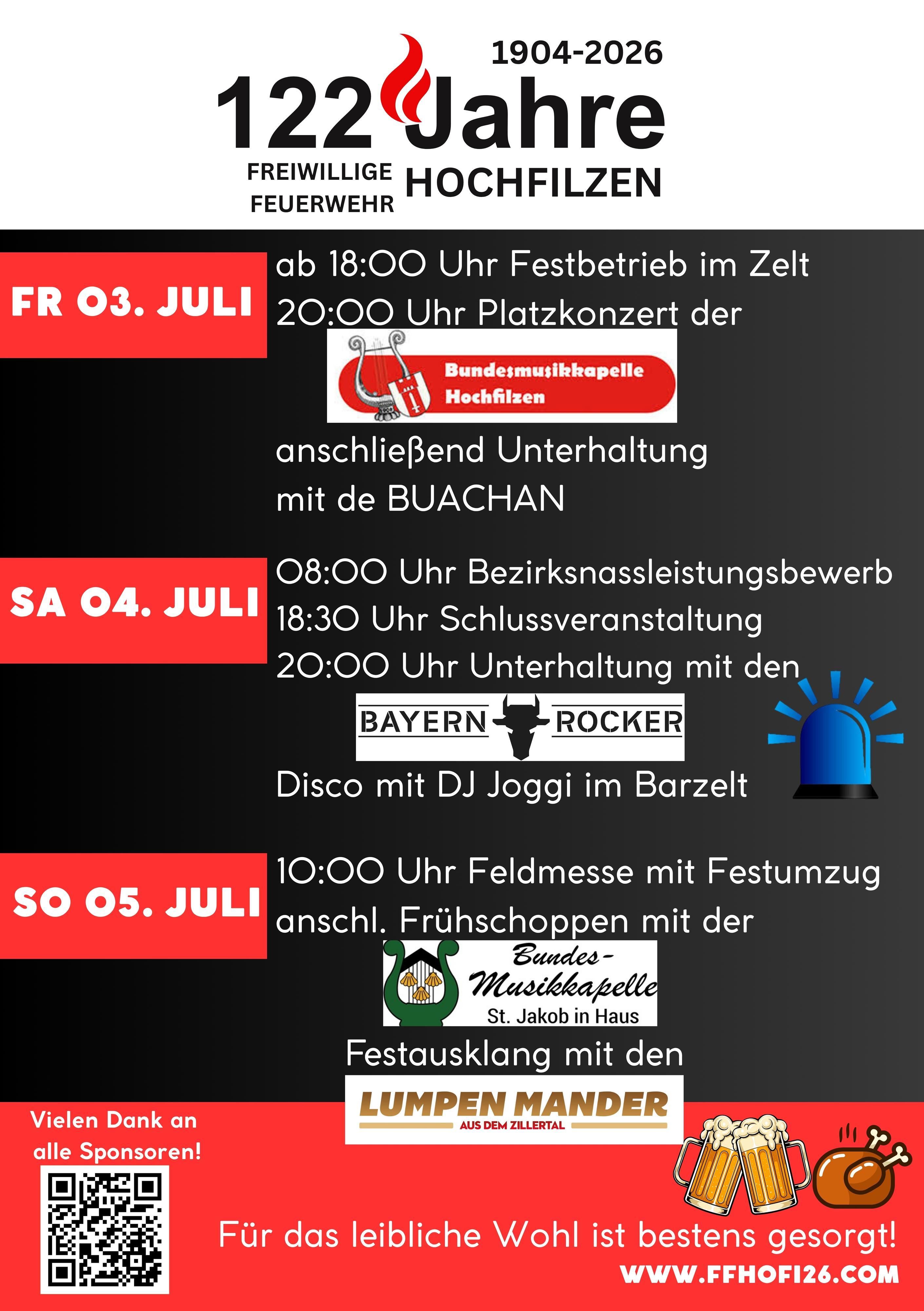 Feuerwehrfest 2026 - 122 Jahre Freiwillige Feuerwehr Hochfilzen mit Bezirksnassleistungswettbewerb | Informationen: Festhomepage | Treffpunkt: Feuerwehr Hochfilzen, Schulgasse 1, 6395 Hochfilzen | Programmübersicht: