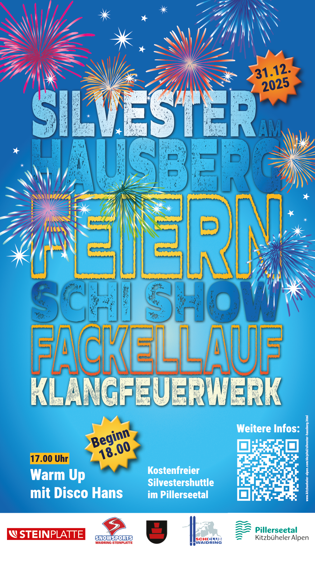 Den Auftakt macht ein energiegeladenes Warmup mit Disco Hans. Es geht weiter mit spektakulären Ski-Showfahrten, ein stimmungsvoller Fackellauf lässt die Nacht in warmem Licht erstrahlen, bevor das große Klangfeuerwerk den Himmel zum Leuchten bringt. Feiern Sie den Jahreswechsel in Waidring und erleben Sie einen Silvesterabend voller Highlights – Kosten: Eintritt frei | Veranstaltungsort: Hausberg, Waidring | Sonstiges: tun Sie sich und der Umwelt etwas Gutes und nutzen Sie den kostenlosen Abendshuttlebus zur Veranstaltung und retour.
