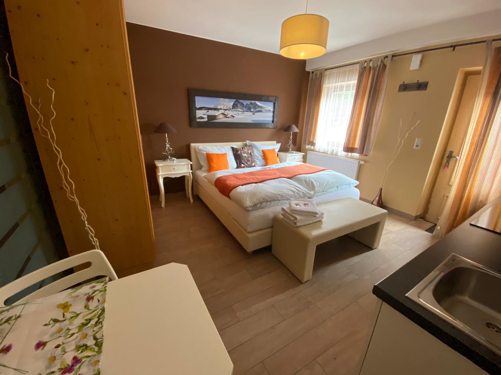The studio is located on the ground floor and is equipped with a double bed, fitted kitchen (with hob, coffee machine, microwave and kettle), bathroom with bathtub and toilet.