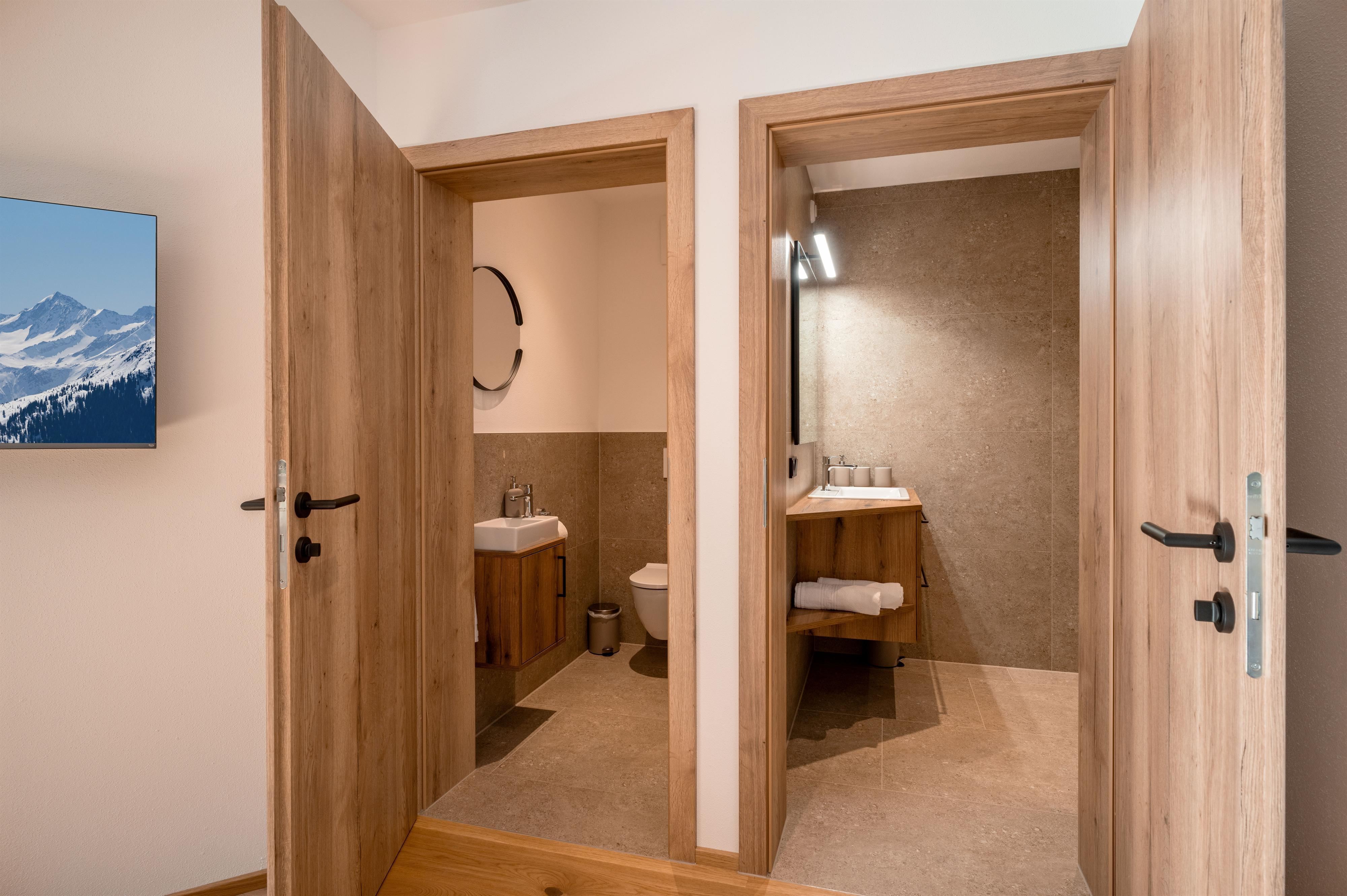 Holiday apartment (53 m²) with an open kitchen and living area, two bedrooms, modern bathroom with towel dryer and separate toilet. Private entrance, terrace, and a separate storage room for bicycles and skis with a dryer for 5 pairs of shoes and an E-bike charging socket.