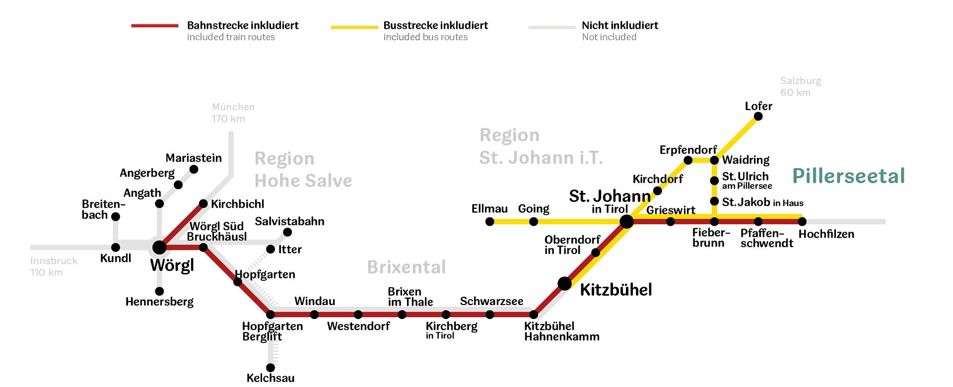 This offer includes all local and InterRegio trains (except IC, EC and RailJet) within the Kitzbühel Alps.