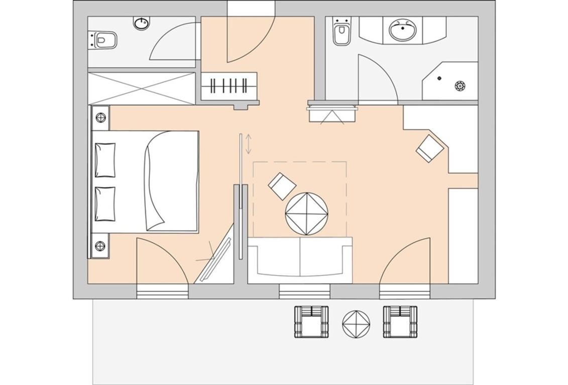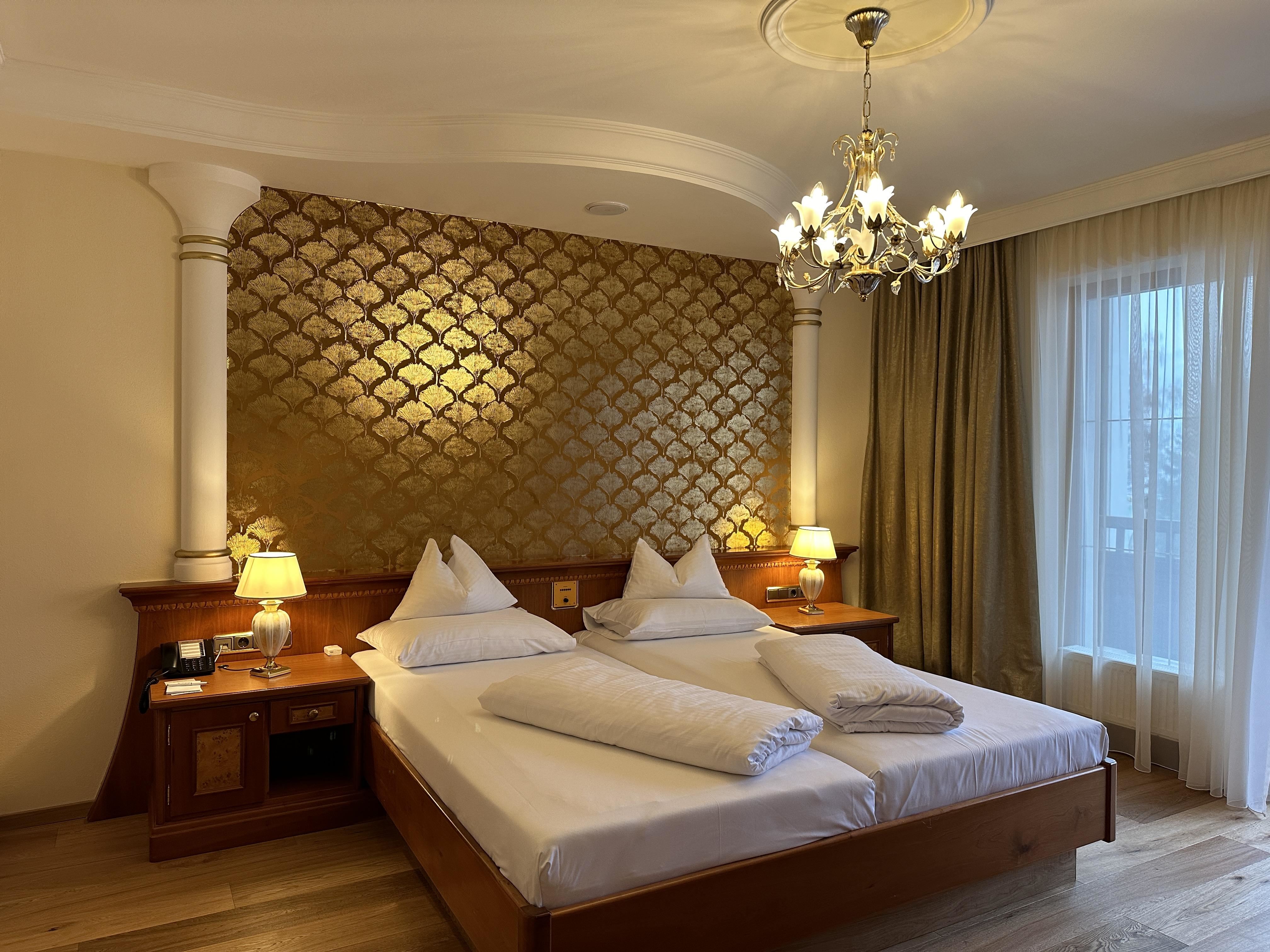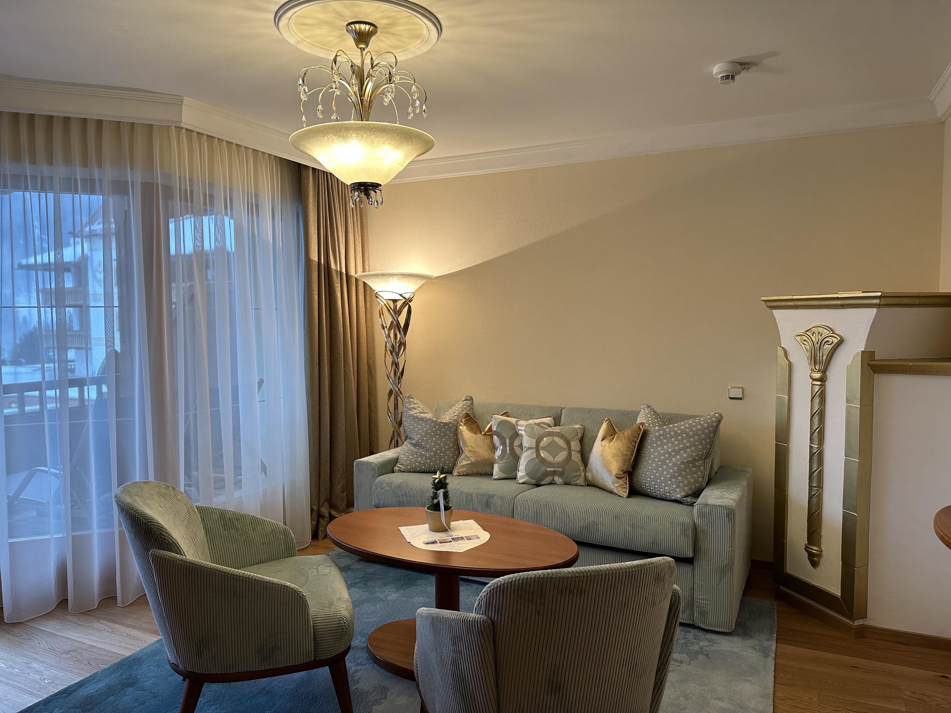 Junior suite with living & sleeping area, tiled stove, bathroom with double sink, bathtub, shower, bidet & toilet, separate toilet, infrared cabin, air conditioning, balcony.