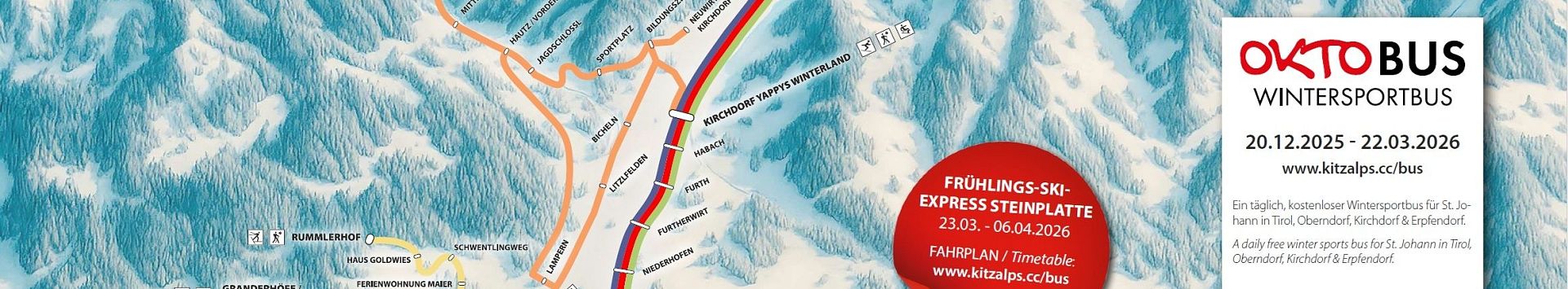 View the timetableThe "Okto Bus"-winter sports buses in the towns of St. Johann in Tirol, Oberndorf, Kirchdorf and Erpfendorf take you free of charge to the ski areas in the region. During the season buses operate daily between the St. Johann in Tirol/Oberndorf, Kirchdorf, Erpfendorf ski area and the Steinplatte. This service is available to all locals, guests, skiers, cross-country skiers, snow-shoe hikers, winter hikers and tobogganers. Travel easily and conveniently with the winter sports buses and by train direct to the ski areas!