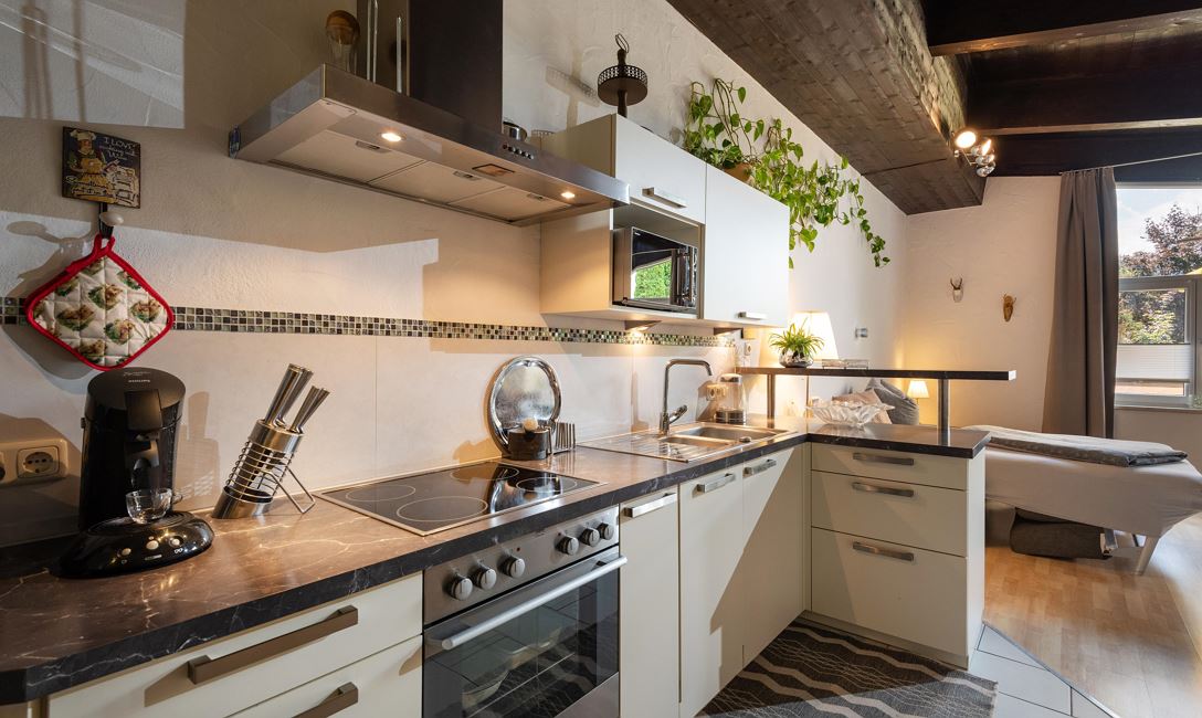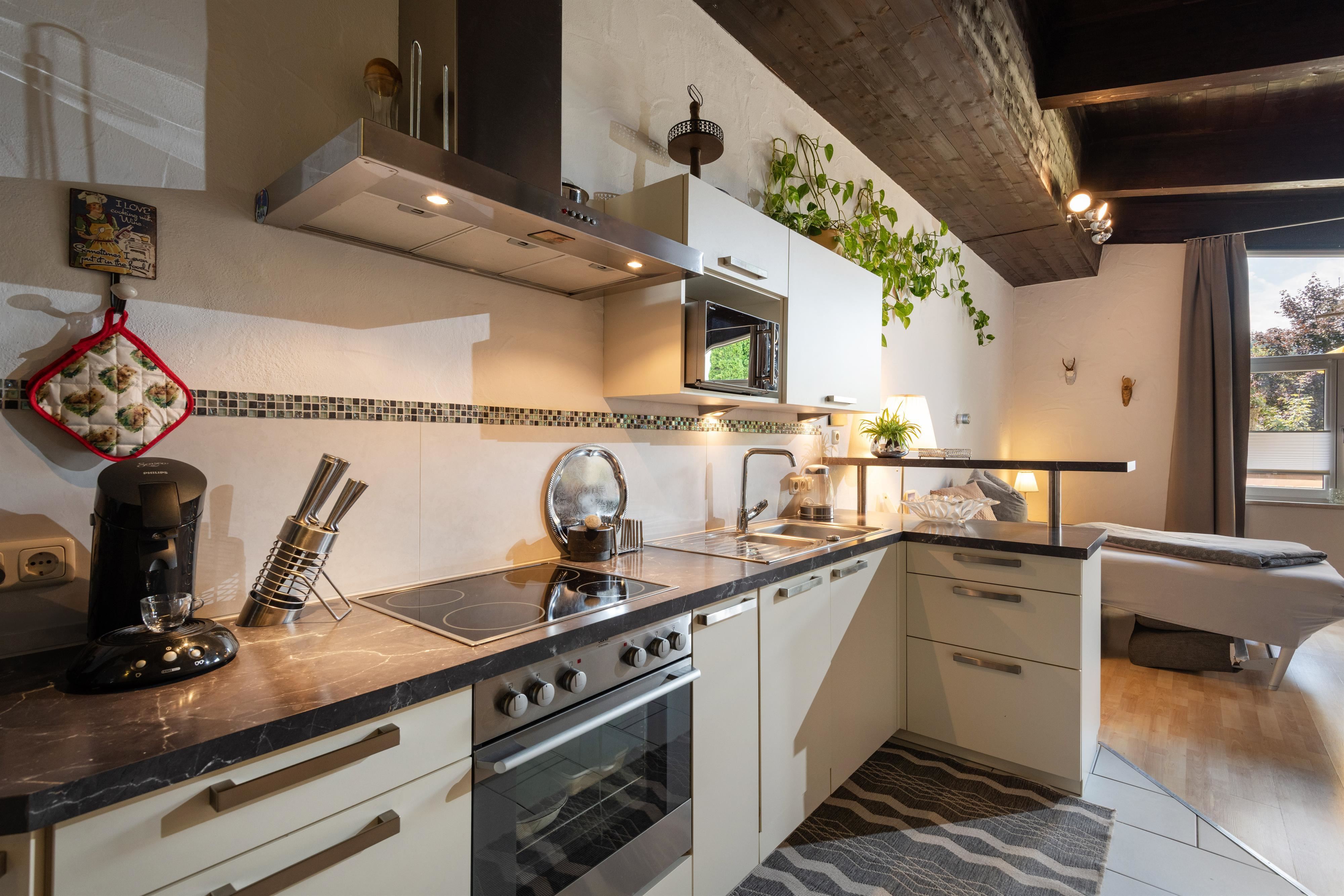 VOLLEDIG UITGERUST: K keuken met oven, vaatwasser, waterkoker, magnetron, koffiezetapparaat met pads, Soda-Stream, toaster...