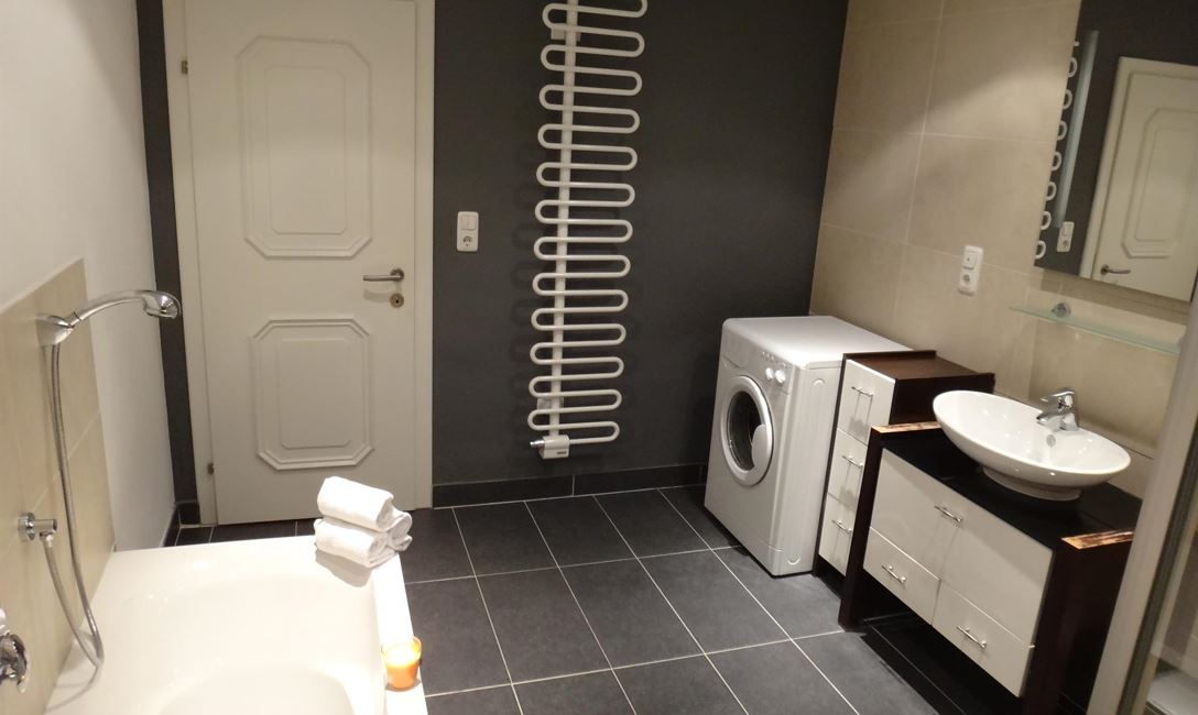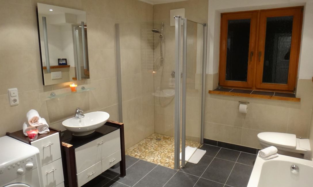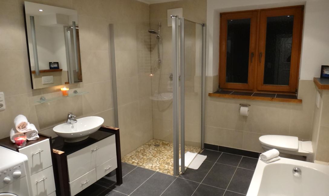 • moderne badkamer met grote douchecabine, ligbad, wastafel en toilet , vloerverwarming en een verwarmd handdoekenrek