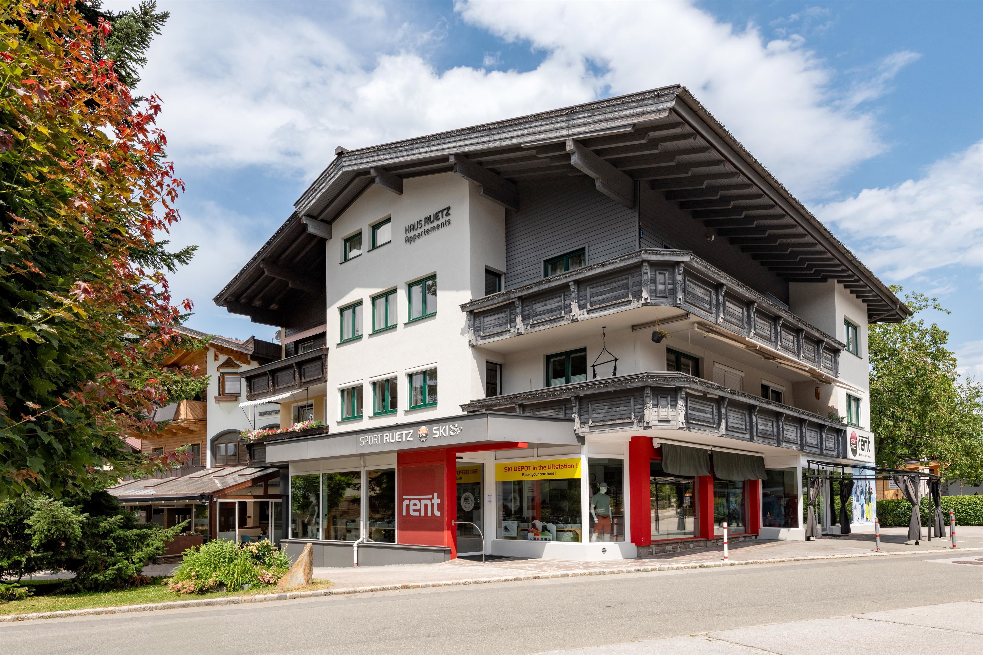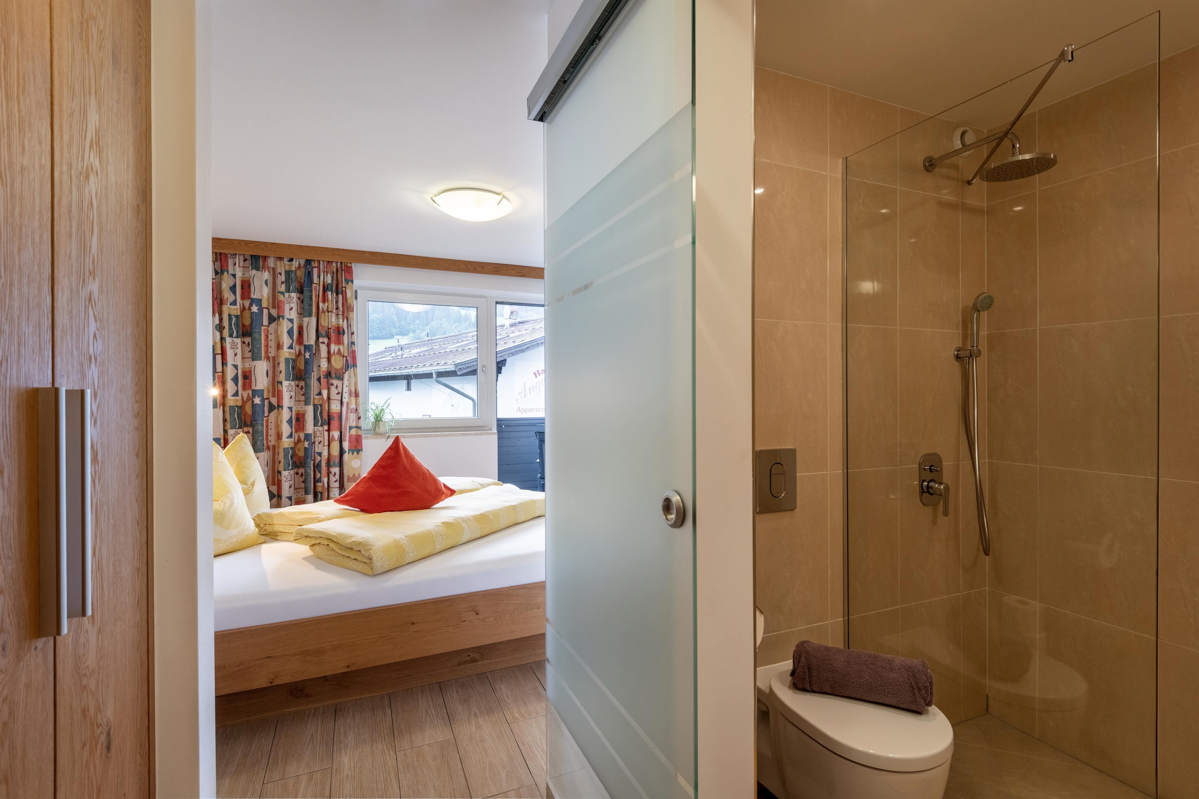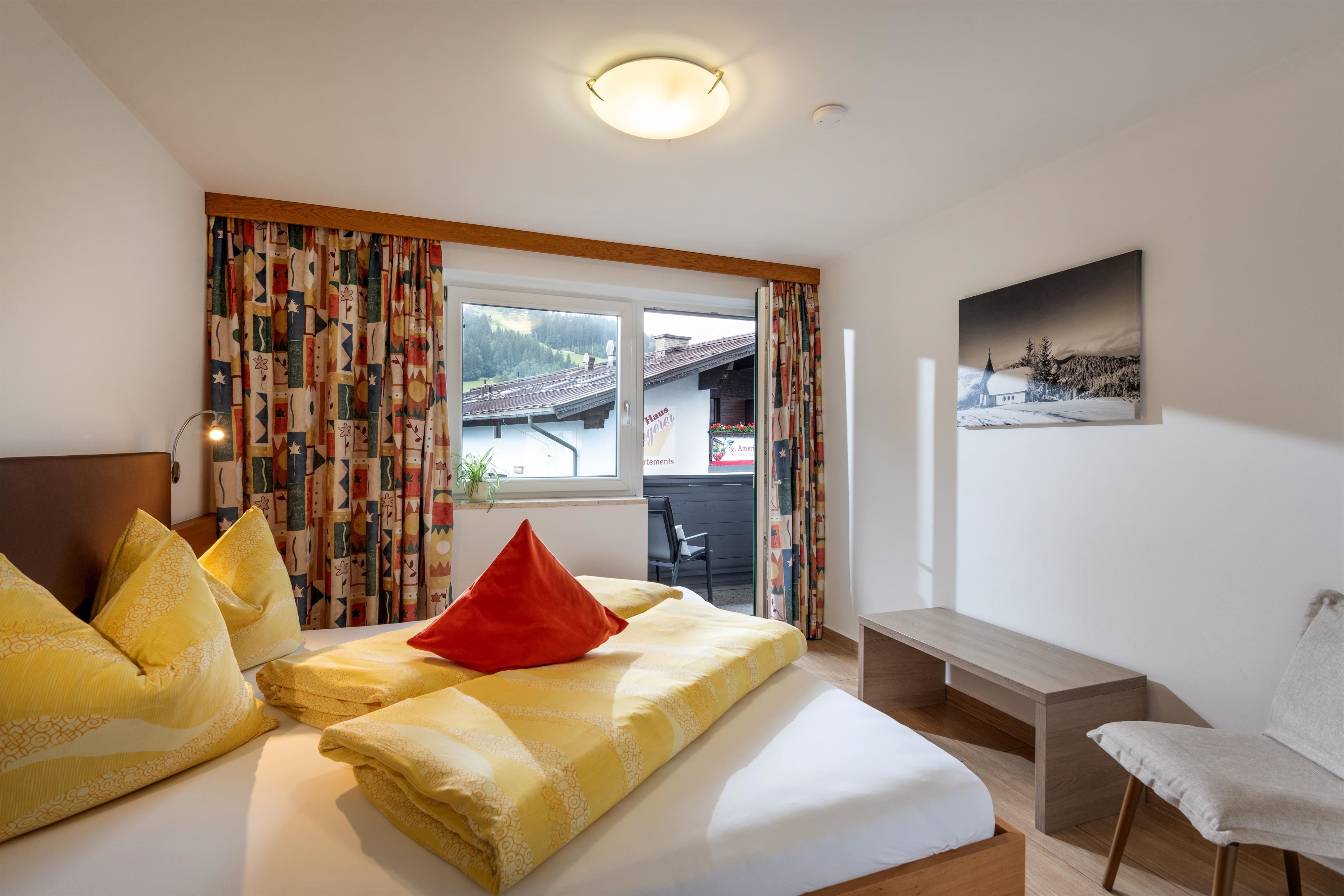 Compleet gerenoveerd appartement, ca. 100 m², 2 slaapkamers, 1 vier-persoonskamer, tv met dvd-player, compleet ingerichte keuken, eethoek met tv, balkon met uitzicht op de Kitzbüheler Alpen, kapstok, 1 grote badkamer met bad/wc en 1 badkamer met douche/wc.