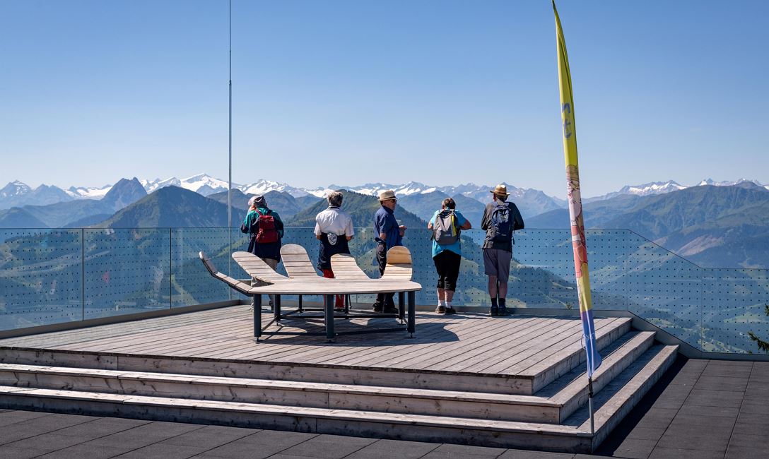 Bij het bergstation van de Zinsbergbahn in de SkiWelt Brixen wacht u een heel bijzondere ervaring: een 360°-panorama met uitzicht op de mooiste bergtoppen van de regio.