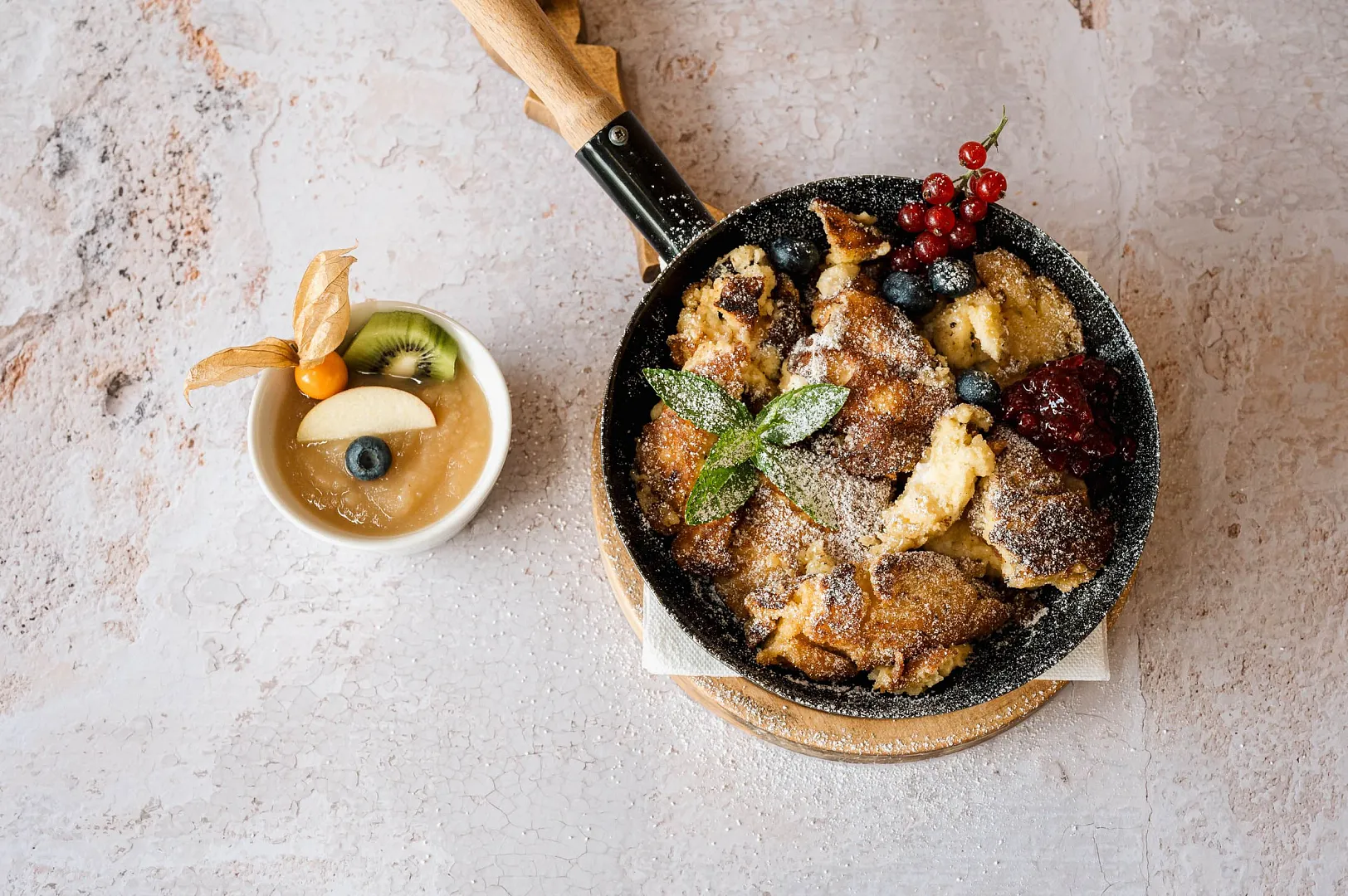 | OF Hertengebraad met oma’s rode kool en servetknödel (of een Angus-gerecht à la carte) | Kaneelparfait | Spek en kastanjes (alleen op reservering) | Gebakken appel zoals vroeger, Kaiserschmarrn met vanillesaus, vanille-ijs, pruimencompote, veenbessen of rozijnen | Kaas & wijn – van wit tot rood, geleverd door wijnmaker Nehrer |