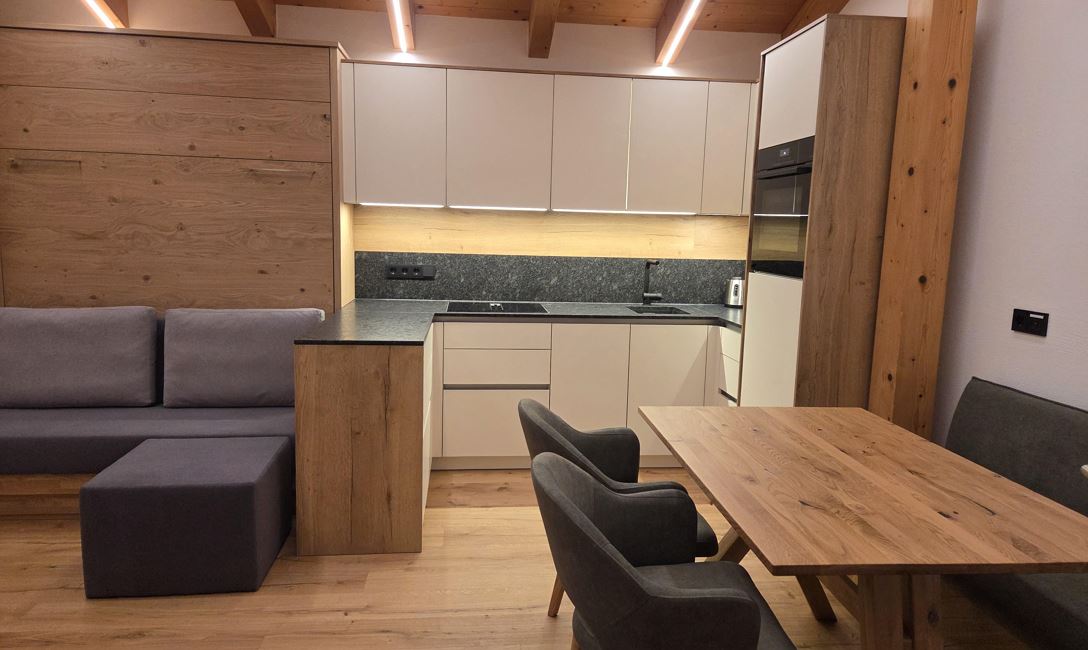De open woon- en eetruimte met moderne keuken biedt veel ruimte om te ontspannen. Een bank met slaapfunctie (lattenbodem en matras) zorgt voor extra slaapcomfort. Vanuit de woonkamer komt u direct op het balkon met prachtig panoramisch uitzicht over de omliggende bergwereld.