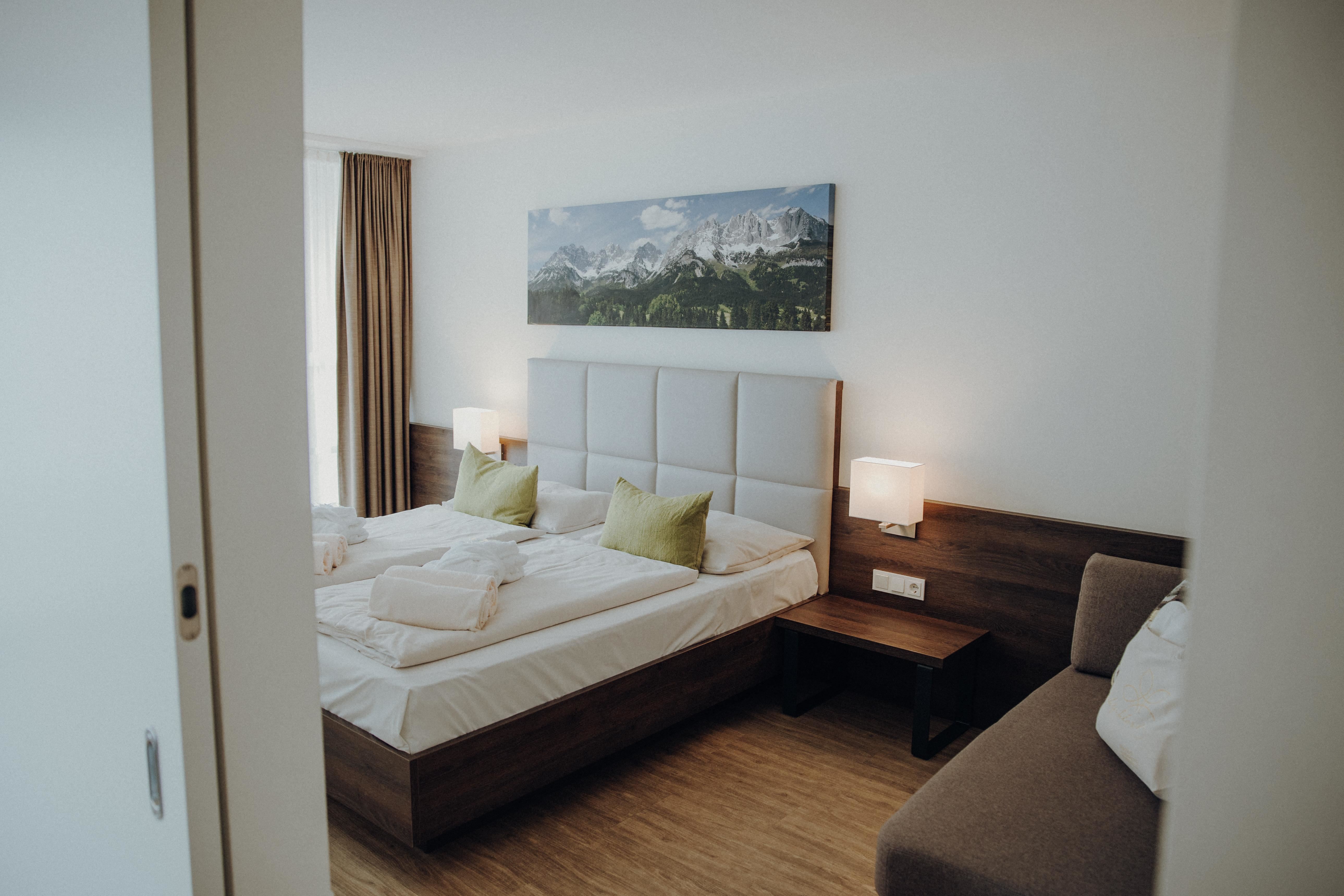 Onze Junior Suites Executive liggen alle op de 4. en 5. etage van het hotel met best uitzicht op het omliggende gebirge. Logies in een nieuwe tweepersoonskamer met balkon, haardroger, moderne badkamer en inloopdouche, kluisje, minibar, SAT-TV, infotainment-system, gratis wifi, gratis wellnesscentrum.