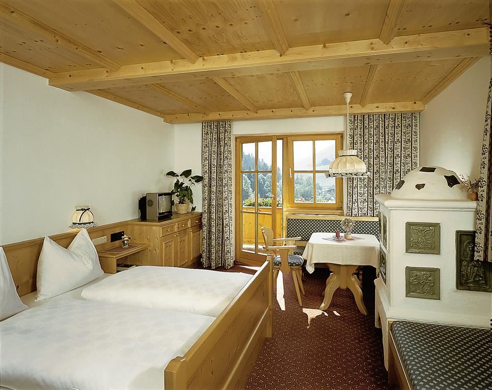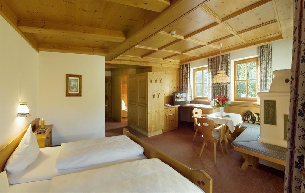 Komfortabele tweepersoonskamer in typisch Tiroler stijl met zithoek, kacheloven, badkuip/WC en balkon, TV, radio, telefoon