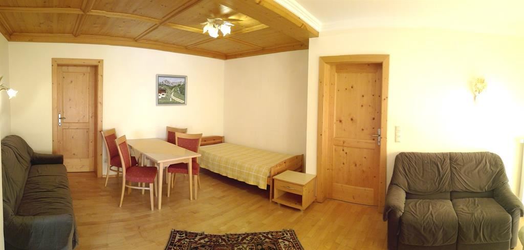 Familiestudio van 46 m² voor 2-5 personen, 1 slaapkamer, 1 woon-slaapkamer; met balkon gericht op Wilder Kaiser, gezellige zithoek Bad met douche, bad, wasbak, föhn; apart toilet, TV in beide kamers, telefoon, koelkast, kluis